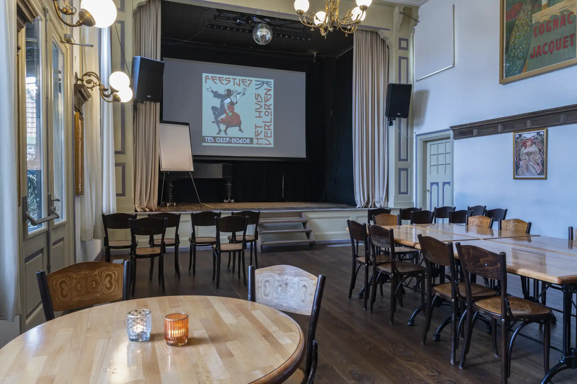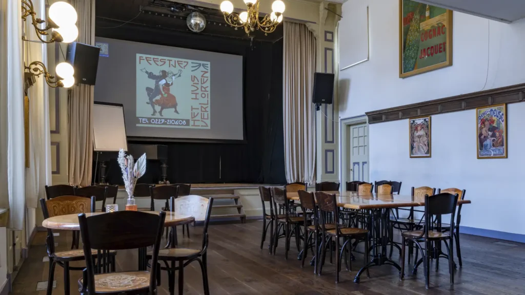 De zaal van Het Huis Verloren is een mooie plek om vergaderingen, workshops, lezingen of andere bijeenkomsten te houden. De ruime vergaderzaal met hoog plafond en veel daglicht, zorgt voor een aangename omgeving. De zaalindeling kan naar wens worden aangepast door middel van (sta-) tafels en stoelen. Het podium kan eveneens worden gebruikt voor presentaties etc.